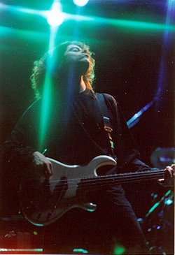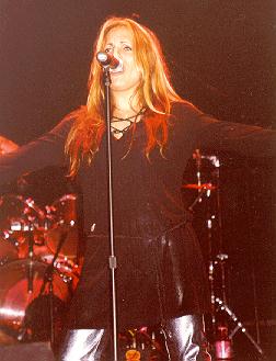 Mariela sang almost exclusively in Spanish and left the stage during the instrumental pieces. One new track had English portions. She is the focal point for the tracks with lyrical parts which often include deeply spiritual messages. In fact, Lalo mentioned that the band's new album entitled Metanoia is due out in late 2000; translated into English, it means Redemption. Mariela's vocal work is very powerful and, despite the heavy orchestrally rich instrumental arrangements, we were impressed by the mix which put her right out in front where we could hear every word. Mariela sings in a similar vocal style to soprano Emilia Derkowska (Quidam) (review) but in the mezzo range; she is a consummate stage performer and an incredible singer. Lalo's keyboard playing is very much in the Keith Emerson style and we were reminded of ELP in many of the instrumental riffs. We heard other portions that were equally Rick Wakeman where Yes-like melodies shone through. Daniel's bass parts were dynamically played and his stage craft was somehwat similar Chris Squire (Yes) and Jon Camp (Renaissance). Guitar parts played by Carlos in his own style were dynamic and the sound was exceptional. We especially enjoyed the interplay between the artists on-stage. Several touching moments involved Mariela's close interaction with Carlos or Daniel as well as the jamming instrumental bridges where Carlos and Daniel played off each others' energy. Carlos' playing at times is somewhat reminiscent of Steve Hackett and also exhibits influences of various rock guitarists. Luis' percussion was crisp and loud, effectively driving the music forward in each of the tracks performed live.